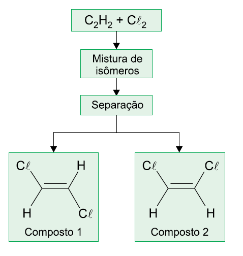 B (FCMSCSP 2019) O fluxograma representa a obtenção de dois compostos orgânicos por meio da cloração do acetileno (C2H2), em condições