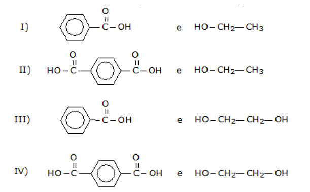 B (CSA 3 – 2012 – BIA – S24) (FUVEST) Os poliésteres são polímeros fabricados por condensação de dois monômeros diferentes, em sucessivas reações de esterificação. Dentre os pares de monômeros abaixo,