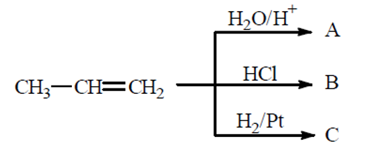 • e) adição, sendo os produtos respectivamente: A = 2-propanol; B = 2-cloro-propano e C = propano.
