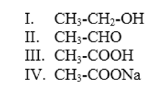 • a) Os nomes dos compostos I, II, III e IV são, respectivamente, etanol, etanal, ácido etanoico e etanoato de sódio.