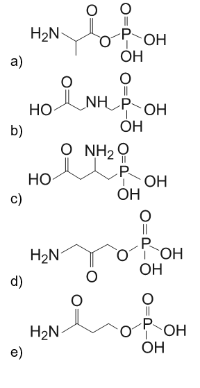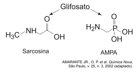 B (ENEM 2013)  O glifosato (C3H8NO5P) é um herbicida pertencente ao grupo químico das glicinas, classificado como não seletivo. Esse composto possui os grupos funcionais carboxilato, amino e fosfonato. A degradação do glifosato no solo é muito rápida e realizada por grande variedade de microrganismos, que usam o produto como fonte de energia e fósforo. Os produtos da degradação são o ácido aminometilfosfônico (AMPA) e o N-metilglicina (sarcosina):