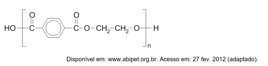 D (ENEM 2013)  O uso de embalagens plásticas descartáveis vem crescendo em todo o mundo, juntamente com o problema ambiental gerado por seu descarte inapropriado. O politereftalato de etileno (PET), cuja estrutura é mostrada, tem sido muito utilizado na indústria de refrigerantes e pode ser reciclado e reutilizado. Uma das opções possíveis envolve a produção de matérias-primas, como o etilenoglicol (1,2-etanodiol), a partir de objetos compostos de PET pós-consumo.