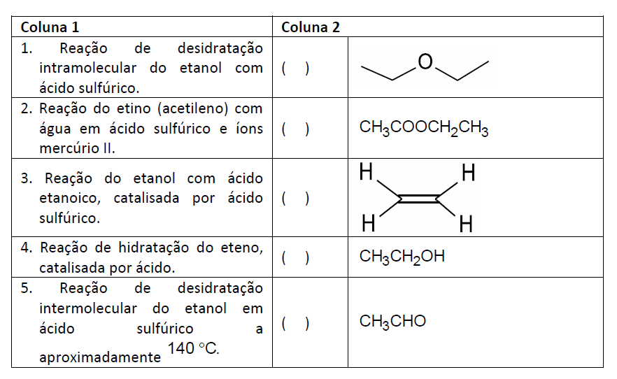 B (CSA 3 – 2012 – BIA – S25) (UNESP) O “éter sulfúrico” é obtido industrialmente pela desidratação do etanol, em presença de H2SO4. A mesma reação, ocorrendo em temperaturas mais elevadas, produz o alceno correspondente. O éter e o alceno têm, respectivamente, as fórmulas: