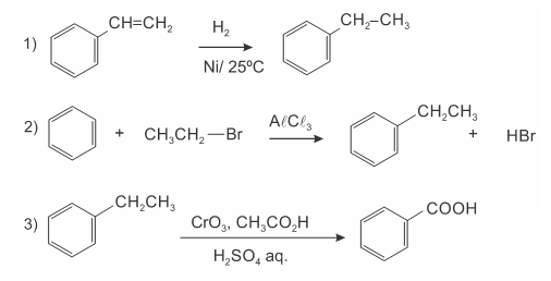 D (MACKENZIE 2018) Os detergentes são substâncias orgânicas sintéticas que possuem como principal característica a capacidade de promover limpeza por meio de sua ação emulsificante, isto é, a capacidade de promover a dissolução de uma substância. Abaixo, estão representadas uma série de equações de reações químicas, envolvidas nas diversas etapas de síntese de um detergente, a partir do benzeno, realizadas em condições ideais de reação.