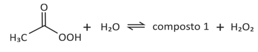 E (FUVEST 2018) Uma das substâncias utilizadas em desinfetantes comerciais é o perácido de fórmula CH3CO3H. A formulação de um dado desinfetante encontrado no comércio consiste em uma solução aquosa na qual existem espécies químicas em equilíbrio, como representado a seguir. (Nessa representação, a fórmula do composto 1 não é apresentada.)