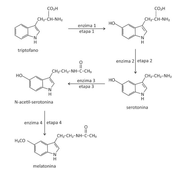 A (FUVEST 2018) O hormônio melatonina é responsável pela sensação de sonolência. Em nosso organismo, a concentração de melatonina começa a aumentar ao anoitecer, atinge o máximo no meio da noite e decresce com a luz do dia. A melatonina é sintetizada a partir do aminoácido triptofano, em quatro etapas catalisadas por diferentes enzimas, sendo que a enzima 3 é degradada em presença de luz.