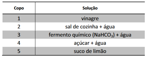 C (FUVEST 2014 – INTERDISCIPLINAR) Uma jovem estudante quis demonstrar para sua mãe o que é uma reação química. Para tanto, preparou, em cinco copos, as seguintes soluções: