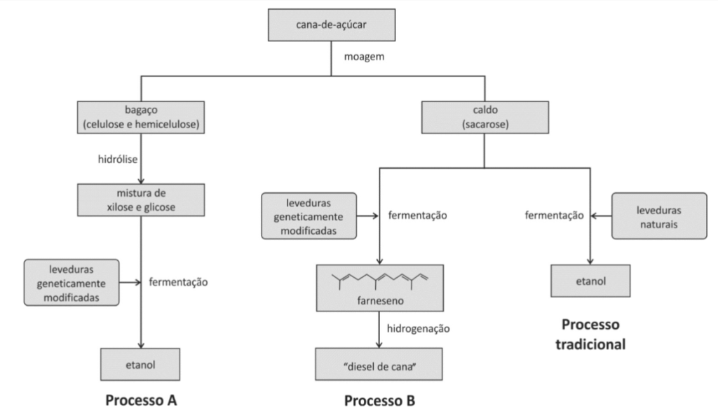 B (FUVEST 2014) No processo tradicional, o etanol é produzido a partir do caldo da cana-de-açúcar por fermentação promovida por leveduras naturais, e o bagaço de cana é desprezado. Atualmente, leveduras geneticamente modificadas podem ser utilizadas em novos processos de fermentação para a produção de biocombustíveis. Por exemplo, no processo A, o bagaço de cana, após hidrólise da celulose e da hemicelulose, também pode ser transformado em etanol. No processo B, o caldo de cana, rico em sacarose, é transformado em farneseno que, após hidrogenação das ligações duplas, se transforma no“diesel de cana”. Esses três processos de produção de biocombustíveis podem ser representados por:
