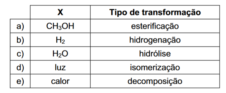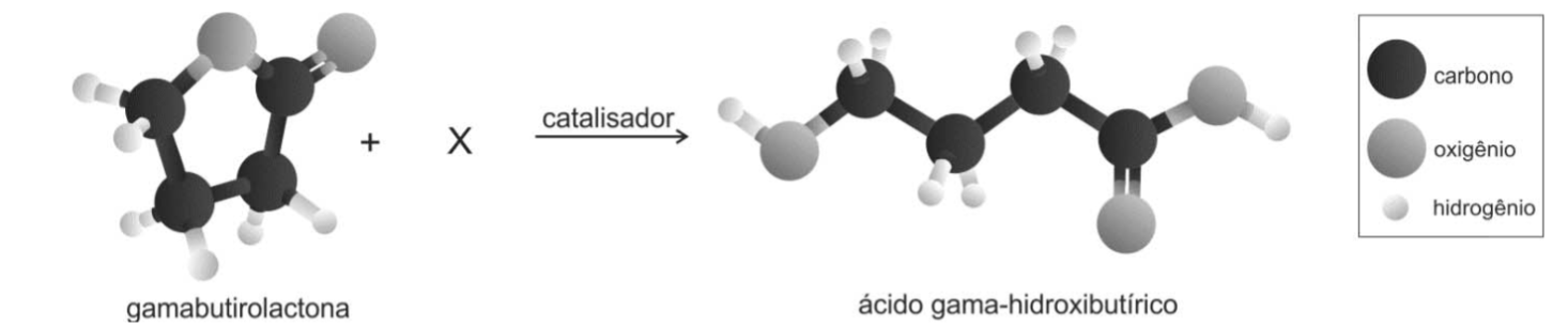 Assinale a alternativa que identifica corretamente X (de modo que a representação respeite a conservação da matéria) e o tipo de transformação que ocorre quando a gamabutirolactona é convertida no ácido gamahidroxibutírico.