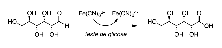 B (UNICAMP 2018) No Brasil, cerca de 12 milhões de pessoas sofrem de diabetes mellitus, uma doença causada pela incapacidade do corpo em produzir insulina ou em utilizá-la adequadamente. No teste eletrônico para determinar a concentração da glicose sanguínea, a glicose é transformada em ácido glucônico e o hexacianoferrato(III) é transformado em hexacianoferrato(II), conforme mostra o esquema a seguir.