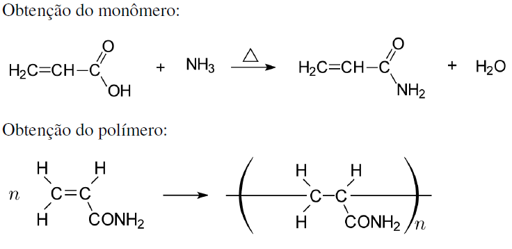 O monômero desse polímero pode ser obtido através da reação do ácido propenóico, também denominado ácido acrílico, com a amônia, por meio de um processo de aquecimento.