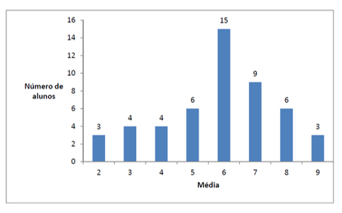 E (FGV SP 2014-1) A média mínima para um aluno ser aprovado em certa disciplina de uma escola é 6. A distribuição de frequências das médias dos alunos de uma classe, nessa disciplina, é dada abaixo: