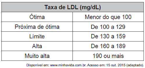 D (ENEM 2018) O colesterol total de uma pessoa é obtido pela soma da taxa do seu “colesterol bom“ com a taxa do seu “colesterol ruim“. Os exames periódicos, realizados em um paciente adulto, apresentaram taxa normal de “colesterol bom”, porém, taxa do “colesterol ruim” (também chamado LDL) de 280 mg/dL. O quadro apresenta uma classificação de acordo com as taxas de LDL em adultos.