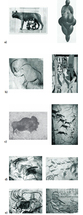 Com base no texto e nos conhecimentos sobre o tema, assinale a alternativa que apresenta, correta e respectivamente, as imagens da arte pré-histórica que representam o estilo animal naturalista (reprodução de imagens perceptíveis) e os símbolos estilizados e dinâmicos da forma humana determinados mais pela sensação que pela observação e que buscam indicar o movimento.