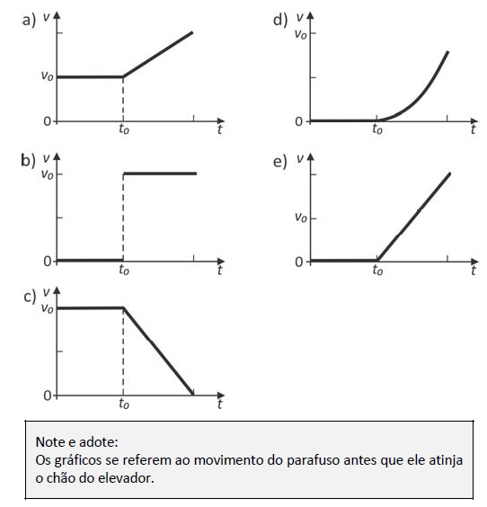 E (FUVEST 2017) Um elevador sobe verticalmente com velocidade constante v0, e, em um dado instante de tempo t0, um parafuso desprende-se do teto. O gráfico que melhor representa, em função do tempo t, o módulo da velocidade v desse parafuso em relação ao chão do elevador é: