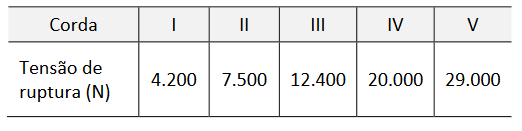 C (FUVEST 2018) O projeto para um balanço de corda única de um parque de diversões exige que a corda do brinquedo tenha um comprimento de 2,0 m. O projetista tem que escolher a corda adequada para o balanço, a partir de cinco ofertas disponíveis no mercado, cada uma delas com distintas tensões de ruptura. A tabela apresenta essas opções.