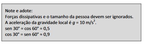 Note e adote: Aceleração da gravidade: 10 m/s2. Desconsidere qualquer tipo de atrito ou resistência ao movimento e ignore a massa do balanço e as dimensões da pessoa. As cordas são inextensíveis.