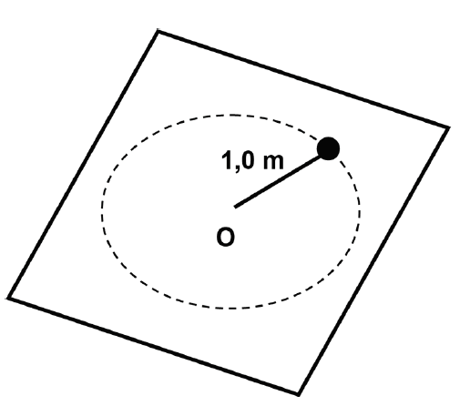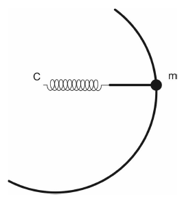 A (FMABC 2018) A figura mostra uma massa m de 2.700 g que descreve uma trajetória circular de raio 30 cm sobre uma superfície horizontal e sem atrito. A massa está presa a uma mola de massa desprezível e de constante elástica 12,5 π2 N/m, que tem a outra extremidade presa no ponto c, centro da trajetória da massa m.