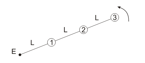 C (UPE 2014) Três partículas idênticas de massa 0,5 kg giram em um plano sem atrito, perpendicular ao eixo de rotação E, conectadas por barras de massas desprezíveis e comprimentos L = 1,0 m cada uma. Observe a figura a seguir: