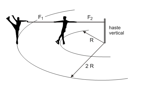 E (UNESP 2014) Em um show de patinação no gelo, duas garotas de massas iguais giram em movimento circular uniforme em torno de uma haste vertical fixa, perpendicular ao plano horizontal. Duas fitas, F1 e F2, inextensíveis, de massas desprezíveis e mantidas na horizontal, ligam uma garota à outra, e uma delas à haste. Enquanto as garotas patinam, as fitas, a haste e os centros de massa das garotas mantêm-se num mesmo plano perpendicular ao piso plano e horizontal