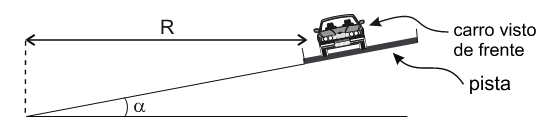 D (UNESP 2010) Curvas com ligeiras inclinações em circuitos automobilísticos são indicadas para aumentar a segurança do carro a altas velocidades, como, por exemplo, no Talladega Superspeedway, um circuito utilizado para corridas promovidas pela NASCAR (National Association for Stock Car Auto Racing). Considere um carro como sendo um ponto material percorrendo uma pista circular, de centro C, inclinada de um ângulo e com raio R, constantes, como mostra a figura, que apresenta a frente do carro em um dos trechos da pista.