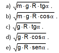 C (FGV 2013) Em um dia muito chuvoso, um automóvel, de massa m, trafega por um trecho horizontal e circular de raio R. Prevendo situações como essa, em que o atrito dos pneus com a pista praticamente desaparece, a pista é construída com uma sobre-elevação externa de um ângulo , como mostra a figura. A aceleração da gravidade no local é g.