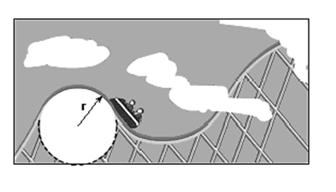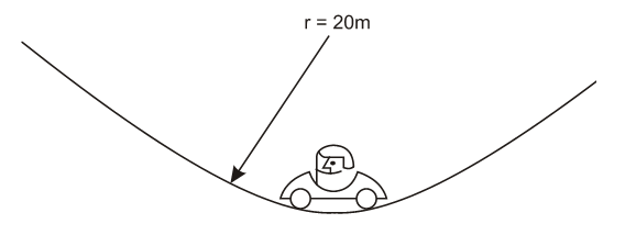 A figura representa em plano vertical um trecho dos trilhos de uma montanha russa na qual um carrinho está prestes a realizar uma curva. Despreze atritos, considere a massa total dos ocupantes e do carrinho igual a 500 kg e a máxima velocidade com que o carrinho consegue realizar a curva sem perder contato com os trilhos igual a 36 km/h. O raio da curva, considerada circular, é, em metros, igual a