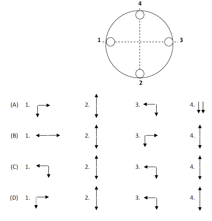 A (UFLA 2010) Um corpo desliza sem atrito ao longo de uma trajetória circular no plano vertical (looping), passando pelos pontos, 1,2,3 e 4, conforme figura a seguir. Considerando que o corpo não perde contato com a superfície, em momento algum, é correto afirmar que os diagramas que melhor representam as direções e sentidos das forças que agem sobre o corpo nos pontos 1,2,3 e 4 são apresentados na alternativa: