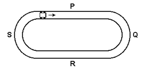 B (UFMG 2004) Daniel está brincando com um carrinho, que corre por uma pista composta de dois trechos retilíneos – P e R – e dois trechos em forma de semicírculos – Q e S -, como representado nesta figura: