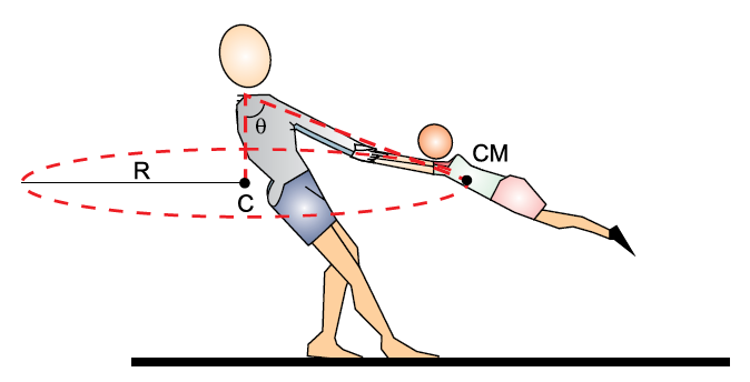 A (FCMSCSP 2019) Um adulto brinca com uma criança segurando-a pelos braços, fazendo-a girar de modo que seu centro de massa (CM) descreve um movimento circular e uniforme em uma circunferência de centro C e raio R = 2 m contida em um plano horizontal. Os braços do adulto e os da criança estão alinhados em uma direção que faz com a vertical um ângulo θ, tal que sen θ = 0,780 e cos θ = 0,624.