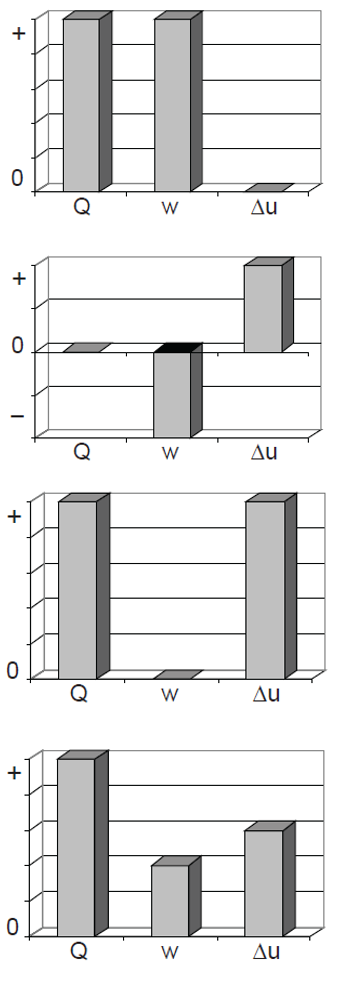 D (PUC RS 2012) Os histogramas a seguir mostram o calor Q e o trabalho W trocados por um gás com o meio externo, bem como a variação da sua energia interna “U. O gás segue a equação geral dos gases (Pv = nRT) nos processos termodinâmicos apresentados.