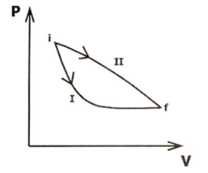 A figura mostra dois processos, I e II, em um diagrama pressão (P) x volume (V) ao longo dos quais um gás ideal pode ser levado do estado inicial i para o estado final f. Assinale a alternativa que preenche corretamente as lacunas do enunciado abaixo, na ordem em que aparecem.