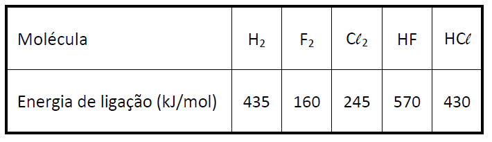 A (FUVEST 2017) Sob certas condições, tanto o gás flúor quanto o gás cloro podem reagir com hidrogênio gasoso, formando, respectivamente, os haletos de hidrogênio HF e HCℓ, gasosos. Pode-se estimar a variação de entalpia (∆H) de cada uma dessas reações, utilizando-se dados de energia de ligação. A tabela apresenta os valores de energia de ligação dos reagentes e produtos dessas reações a 25 °C e 1 atm.