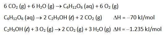 E (FUVEST 2018) A energia liberada na combustão do etanol de cana de açúcar pode ser considerada advinda da energia solar, uma vez que a primeira etapa para a produção do etanol é a fotossíntese. As transformações envolvidas na produção e no uso do etanol combustível são representadas pelas seguintes equações químicas: