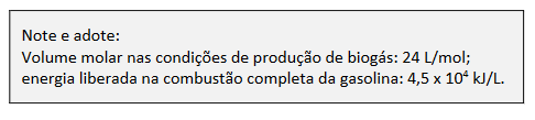 B (FUVEST 2016) O biogás pode substituir a gasolina na geração de energia. Sabe-se que 60%, em volume, do biogás são constituídos de metano, cuja combustão completa libera cerca de 900 kJ/mol. Uma usina produtora gera 2.000 litros de biogás por dia. Para produzir a mesma quantidade de energia liberada pela queima de todo o metano contido nesse volume de biogás, será necessária a seguinte quantidade aproximada (em litros) de gasolina: