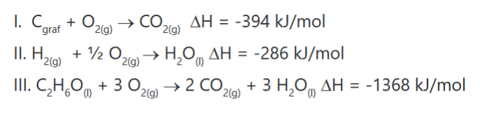 Com base nas equações abaixo que resultam na reação de interesse, calcule o ∆H da reação de formação do etanol.