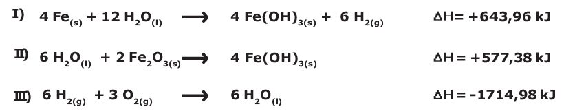 Com base nesses dados, é possível afirmar que, quando há produção de somente 1(um) mol de óxido de ferro III, a partir de substâncias simples, ocorre