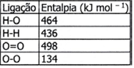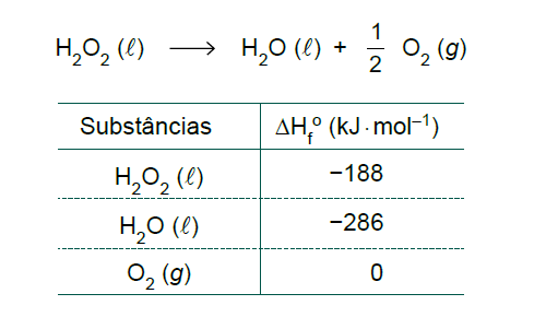 D (FCMSCSP 2018) A água oxigenada, solução de peróxido de hidrogênio (H2O2), tem diversos usos no ambiente doméstico. A tabela apresenta as entalpias-padrão de formação das substâncias envolvidas na reação de decomposição do peróxido de hidrogênio: