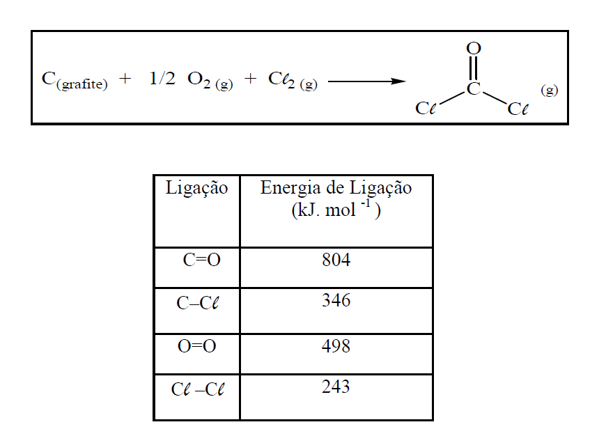 A (UFJF – PISM 2 2010) O fosgênio (COCl2) ou diclorometanona é um gás tóxico que foi utilizado na Primeira Guerra Mundial como arma química do tipo sufocante. Utilizando os dados a seguir, calcule o H de formação do gás fosgênio, em kJ/mol, e assinale a alternativa CORRETA.