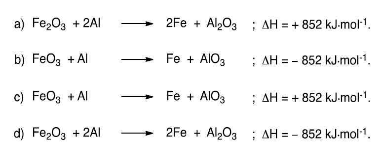 o trilho novo e o usado empregou-se uma reação química denominada térmita, que permite a obtenção de uma temperatura local de cerca de 2.000 °C. A reação utilizada foi entre um óxido de ferro e o alumínio metálico. De acordo com essas informações, uma possível equação termoquímica do processo utilizado seria