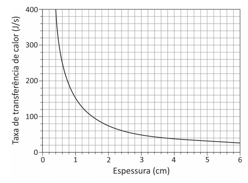 B (FUVEST 2018) Um fabricante de acessórios de montanhismo quer projetar um colchão de espuma apropriado para ser utilizado por alpinistas em regiões frias. Considere que a taxa de transferência de calor ao solo por uma pessoa dormindo confortavelmente seja 90 kcal/hora e que a transferência de calor entre a pessoa e o solo se dê exclusivamente pelo mecanismo de condução térmica através da espuma do colchão. Nestas condições, o gráfico representa a taxa de transferência de calor, em J/s, através da espuma do colchão, em função de sua espessura, em cm.