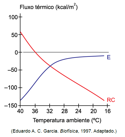 D (UNESP 2018) O gráfico mostra o fluxo térmico do ser humano em função da temperatura ambiente em um experimento no qual o metabolismo basal foi mantido constante. A linha azul representa o calor trocado com o meio por evaporação (E) e a linha vermelha, o calor trocado com o meio por radiação Sabendo que os valores positivos indicam calor recebido