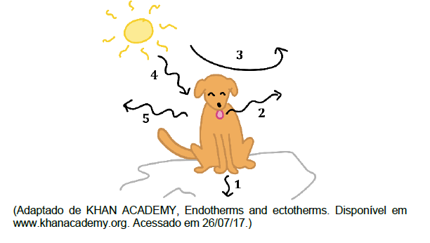 C (UNICAMP 2018) Mesmo em manhãs bem quentes, é comum ver um cão tomando sol. O pelo do animal esquenta e sua língua do lado de fora sugere que ele está cansado. O pelo do animal está muito quente, mas mesmo assim o cão permanece ao sol, garantindo a produção de vitamina D3. Durante essa exposição ao sol, ocorrem transferências de energia entre o cão e o ambiente, por processos indicados por números na figura abaixo.
