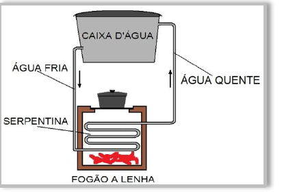 C (UFRN 2012) O uso de tecnologias associadas às energias renováveis tem feito ressurgir, em Zonas Rurais, técnicas mais eficientes e adequadas ao manejo de biomassa para produção de energia. Entre essas tecnologias, está o uso do fogão a lenha, de forma sustentável, para o aquecimento de água residencial. Tal processo é feito por meio de uma serpentina instalada no fogão e conectada, através de tubulação, à caixa d’água, conforme o esquema mostrado na Figura seguir.