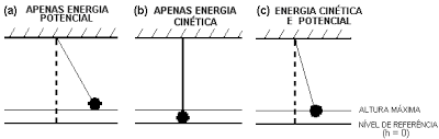 Nas posições intermediárias entre o ponto mais baixo e o ponto no qual a amplitude de oscilação é máxima (ponto mais alto) existe uma combinação de energia potencial gravitacional e de energia cinética (c) de tal forma que a soma delas, desprezando-se o atrito com o ar, é constante (Princípio da Conservação da Energia Mecânica).