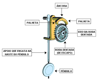 A figura a seguir mostra um desenho do relógio de pêndulo projetado por Galileu em 1641, um ano antes de morrer, e construído parcialmente por Vizencio, seu filho, que morreu antes de concluir.