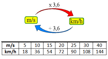 As unidades mais utilizadas para velocidade são o m/s (SI) e o km/h. A tabela a seguir mostra algumas correspondências entre essas unidades.
