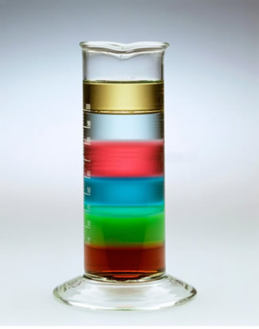 Líquidos de densidades diferentes. Os mais densos ficam mais pro fundo enquanto os menos densos ficam mais próximos da superfície.