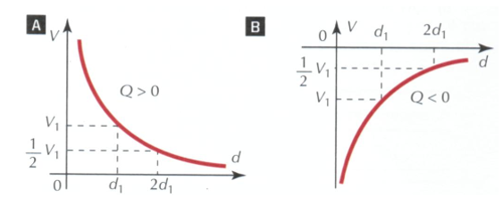 - Para cargas positivas, quanto mais distante o ponto estiver da carga, menor é módulo do potencial elétrico.