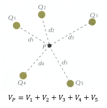 O potencial resultante de um certo ponto, devido a ação de várias cargas, é a soma algébrica dos potenciais individuais das mesmas cargas naquele ponto.